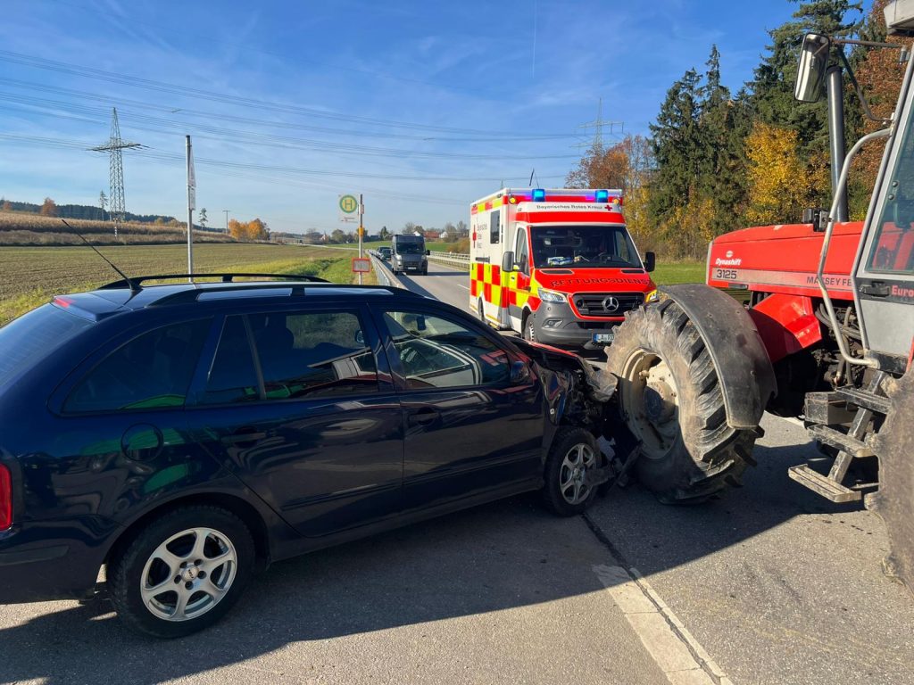 Am 05.11.2025, gegen 13:10 Uhr, befuhr eine 54-Jährige Fahrerin eines Traktors die Kreisstraße 21 von Geisenhausen kommend in Richtung Haunersdorf. Auf Höhe der Abzweigung nach Albanstetten, wollte die 54-Jährige nach links abbiegen. Hierbei übersah sie den Skoda einer 60-Jährigen, die das Traktorgespann gerade überholen wollte.