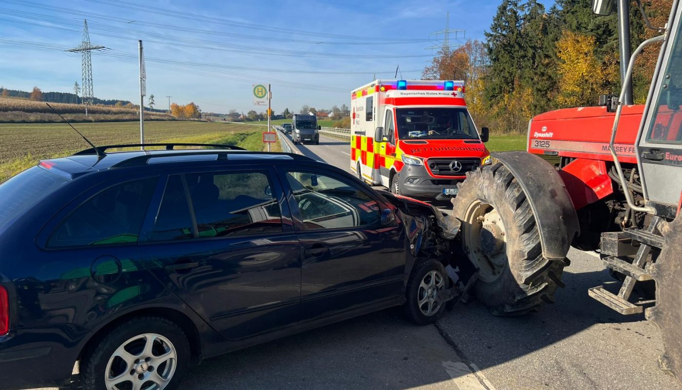 Am 05.11.2025, gegen 13:10 Uhr, befuhr eine 54-Jährige Fahrerin eines Traktors die Kreisstraße 21 von Geisenhausen kommend in Richtung Haunersdorf. Auf Höhe der Abzweigung nach Albanstetten, wollte die 54-Jährige nach links abbiegen. Hierbei übersah sie den Skoda einer 60-Jährigen, die das Traktorgespann gerade überholen wollte.