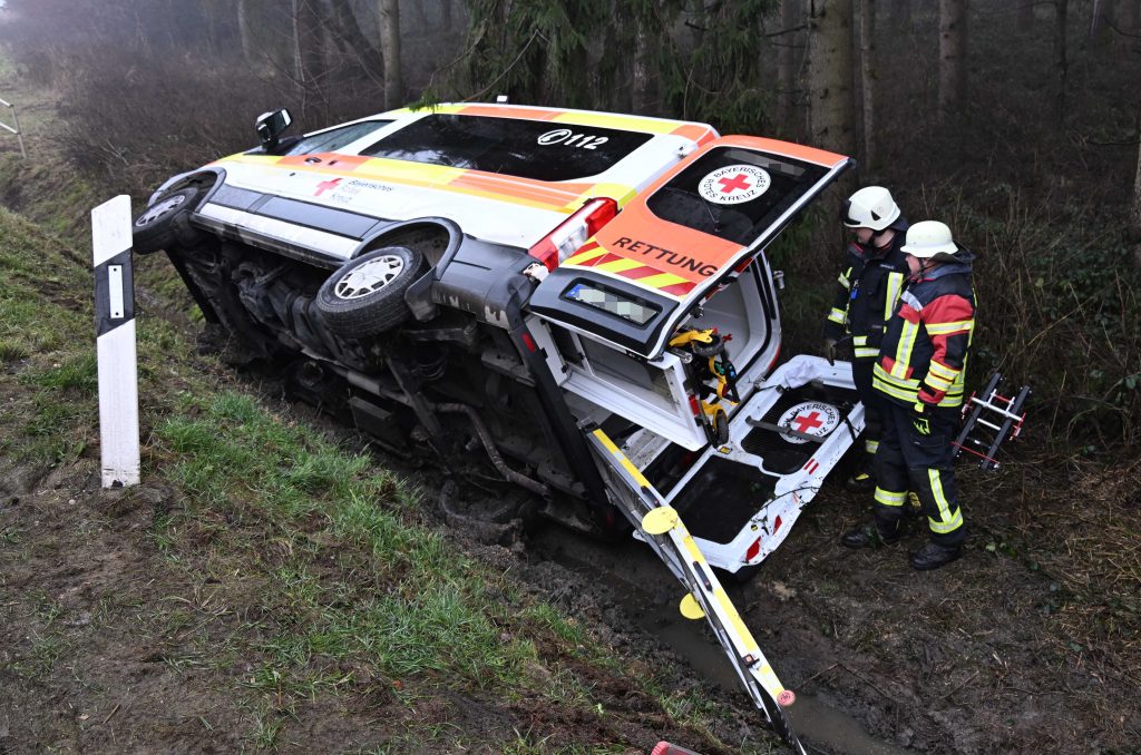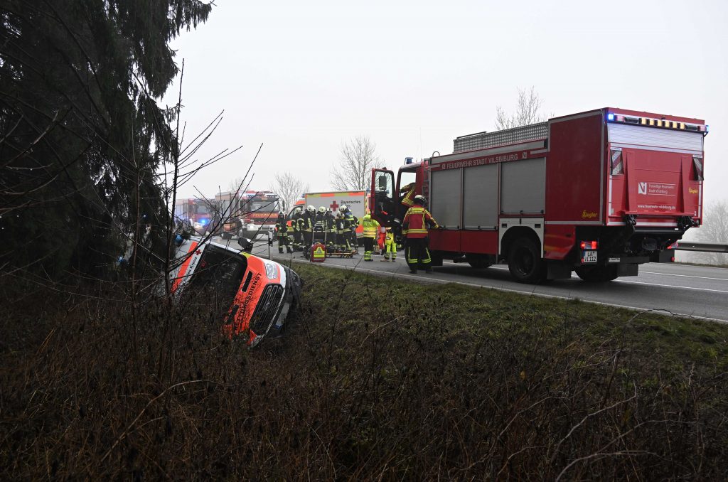 Krankentransportwagen verunglückt, 4 Personen verletzt, B299, Gmd. Vilsbiburg, Lkr. Landshut, 19.12.2025 ca. 14.10 Uhr